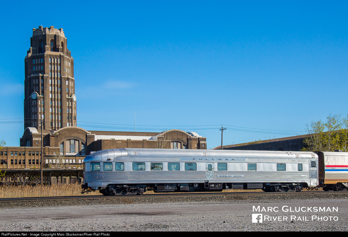 | A classic New York Central Railroad scene at Buffalo Central Terminal is recreated with Amtrak Train 48 at just before 0900. The former New York Central Babbling Brook (PPCX 800007) is bringing up the markers on home rails here, as it used to cover the Chicago to Boston version of what is now the "Lake Shore Limited" as the "New England States", although in stopping here would have been under the now derelict train shed. Buffalo Central hosted train arrival from 1929 until 10/28/1979 when Amtrak moved its station to Dick Road in Depew. |