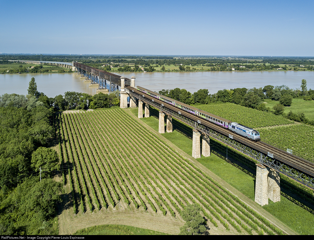 Intercity linking Bordeaux to Nantes is crossing the 2178m / 7146 ft long Cubzac Bridge over the Dordogne river.