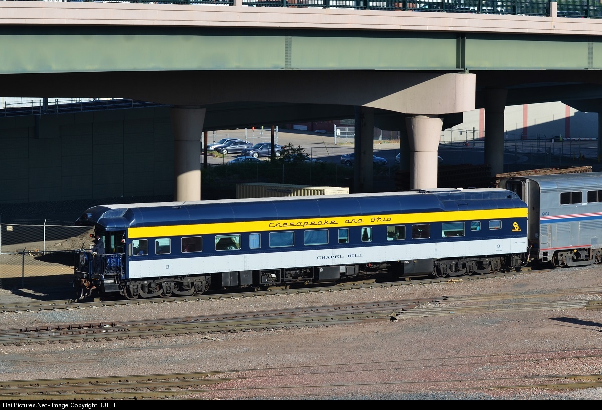 Its always a treat to see a private car on the back of the California Zephyr. Here the Chesapeake & Ohio "Chapel Hill" is on point as the Amtrak backs into Denver's Union Station.