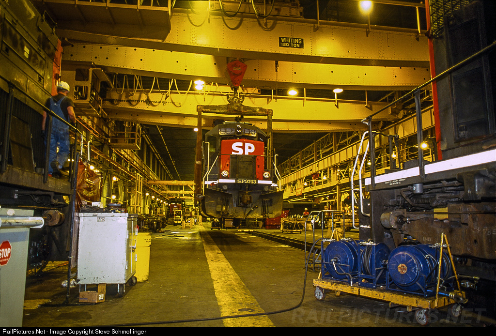 | Workmen at UP's Burnham Shops use a 120-ton capacity Whiting crane to lift the superstructure of SP GP60 No. 9743 off its trucks. Meanwhile, a mechanic at left goes about his work as though nothing monumental is taking place, likely having seen such feats many times before. |