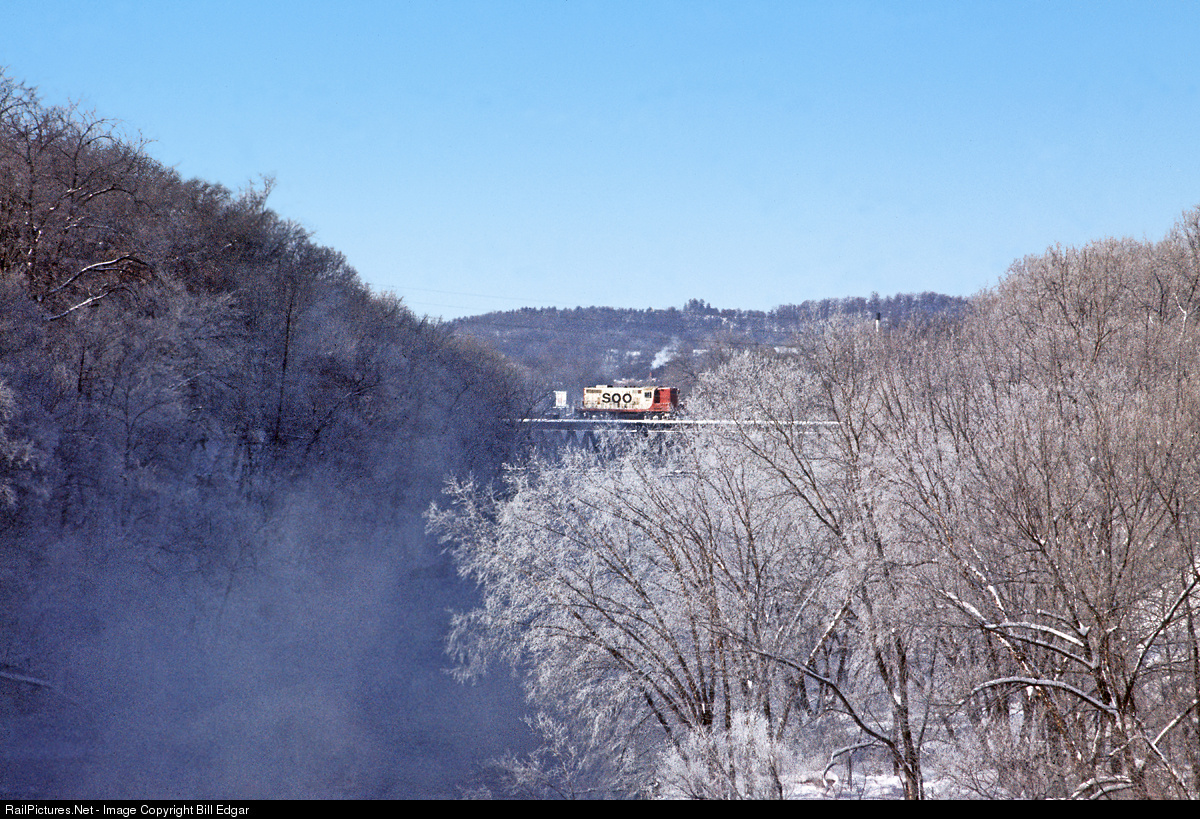 SOO GP7 381 rolls across the Eau Claire River as below zero temperatures create icy steam on the water and frost the trees. The railroad had a stub end yard to the left of the bridge, then used Milwaukee Road tracks to access SOO's own branch line to Chippewa Falls, WI where it connected with their mainline.