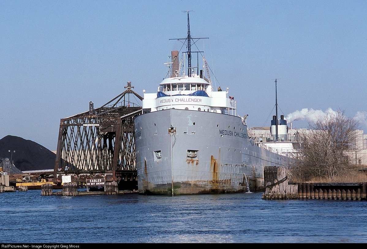The crew of the Medusa Challenger checks clearances as they navigate the C&NW KK River bridge in Milwaukee, WI in December of 1994. The C&NW bridge was once double tracked and carried numerous passenger trains daily (including the famed "400") on their way to the Milwaukee depot. Today, and at the time of this photo, the bridge is single track and only sees one local train a day. It is operated from the river shoreline. The Challenger was built in 1906 and still survives, although it has been cut down to a barge