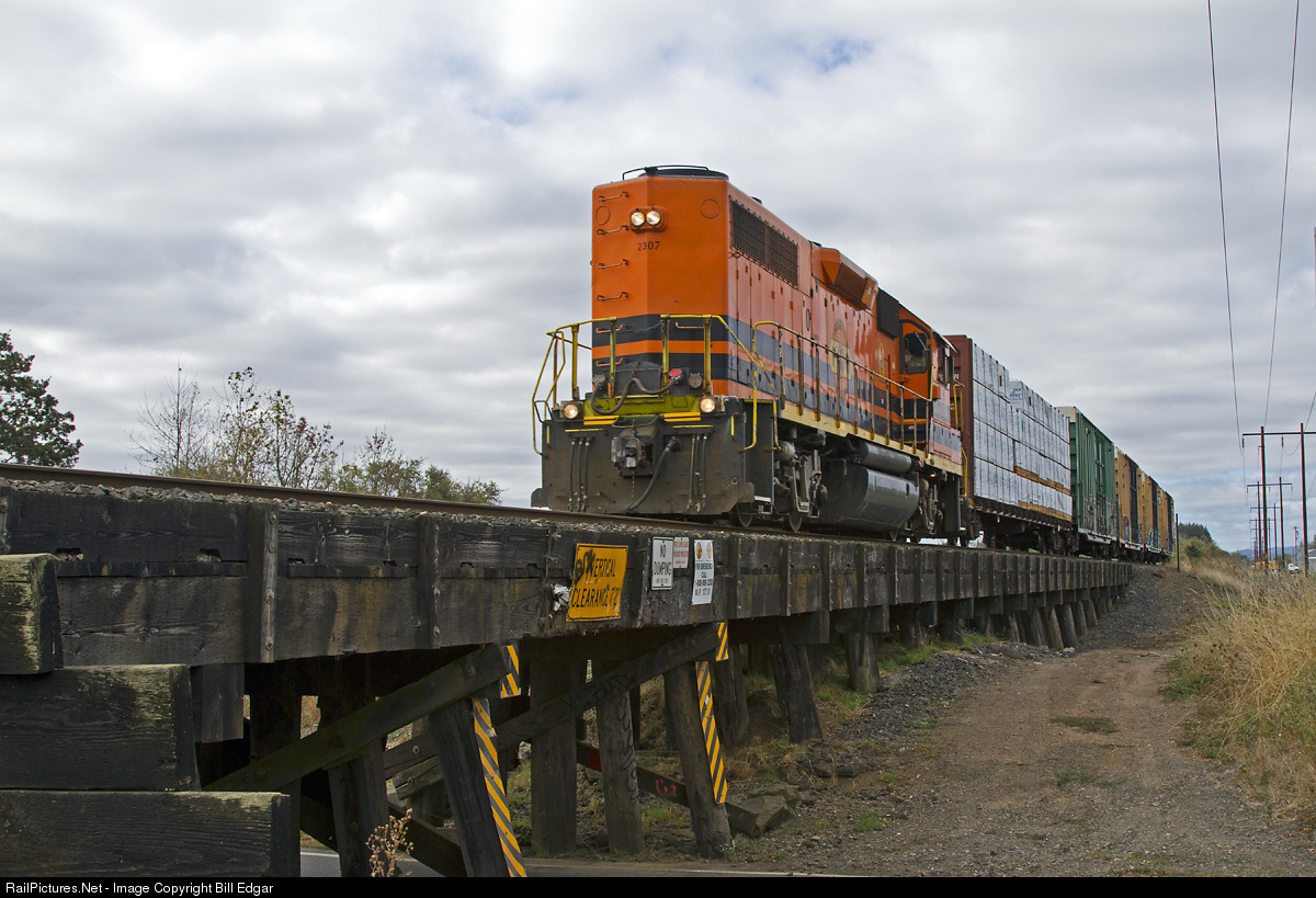 | PNWR 2307 leads its local north from Junction City, OR crossing a ballasted deck wood trestle over Ayres Lane en route to Harrisburg, OR where the train will do some switching before returning south to Eugene. Vertical clearance for the roadway is quite limited on this former Oregon Electric trestle. |