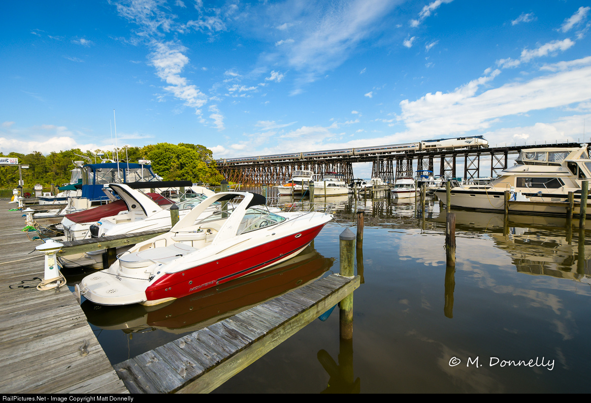 A southbound Northeast Regional in Amtrak Virginia service heads past the marina at Neabsco Creek.