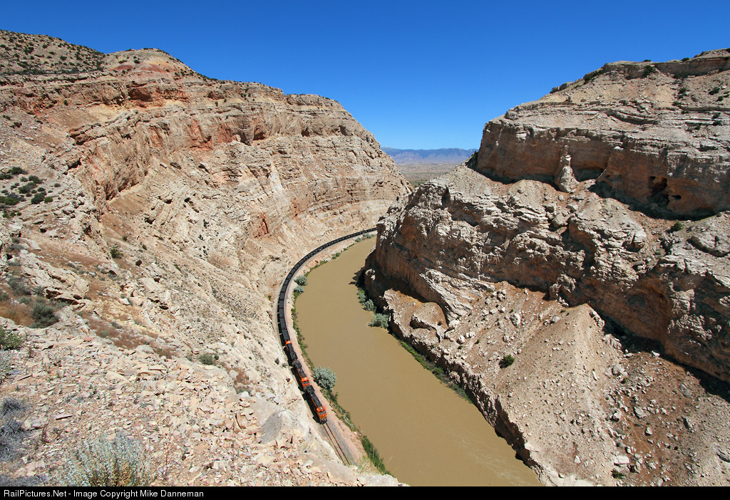 From the rim of Sheep Canyon is a striking view of a southbound BNSF freight curving along the Bighorn River on June 22, 2017. What looks like coal up front is actually coke loaded in GATX hoppers from Billings, Montana. This breathtaking canyon is north of Greybull at milepost 414 on BNSF’s Casper Subdivision.