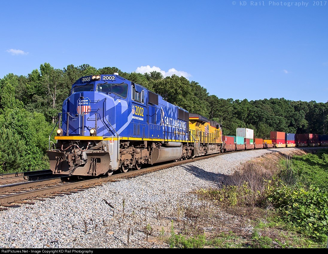 Grinding up the southeast side of Braswell Mountain on the main 1 track is the northbound NS 23N (Atlanta,GA-Rossville,TN) heading for Chattanooga, TN. Almost like a cross country Olympic Torch runner the intermodal freight is being led by Union Pacific's #2002 the Salt Lake City Winter Olympics motor, and UP 7964 the 5,000th Gevo' working hand and hand to keep up the pace on the grueling grade just northwest of Dallas, GA. Photo from the John Kirk Collection