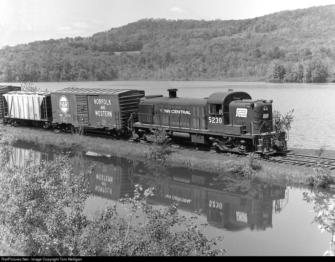 A former NYC RS-3 is in charge of Penn Central's Pittsfield-Adams (MA) local freight as it crosses the Cheshire Reservoir causeway at Cheshire, MA, northbound on a spring morning. This part of the scenic Pittsfield-North Adams branch was abandoned in 1990 by subsequent owner Boston & Maine and is now a rail trail.