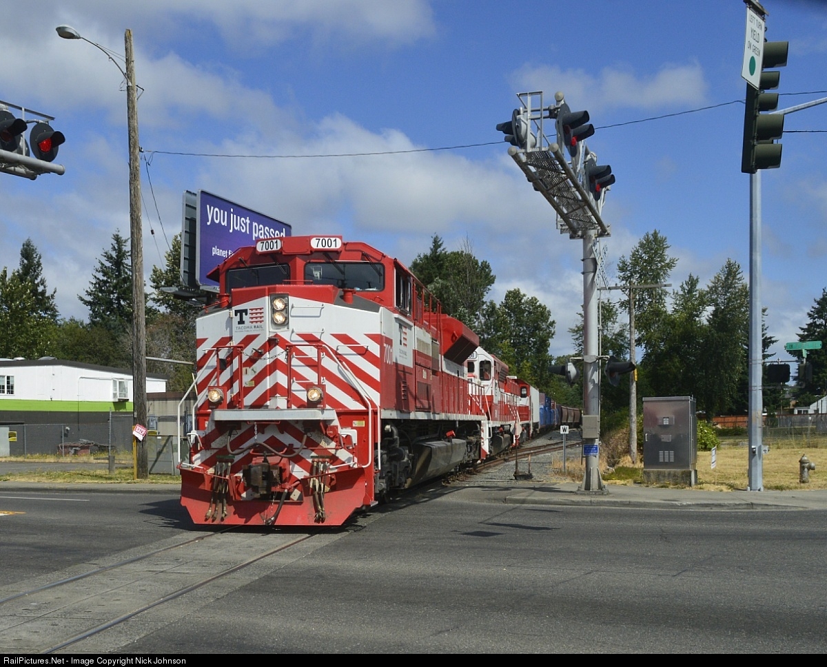 | TMRW SD70ACe #7001, TMRW SD40-3 #3001, and TMRW 3GS21B #2100 lead TMRW 101 through Tacoma, WA. |