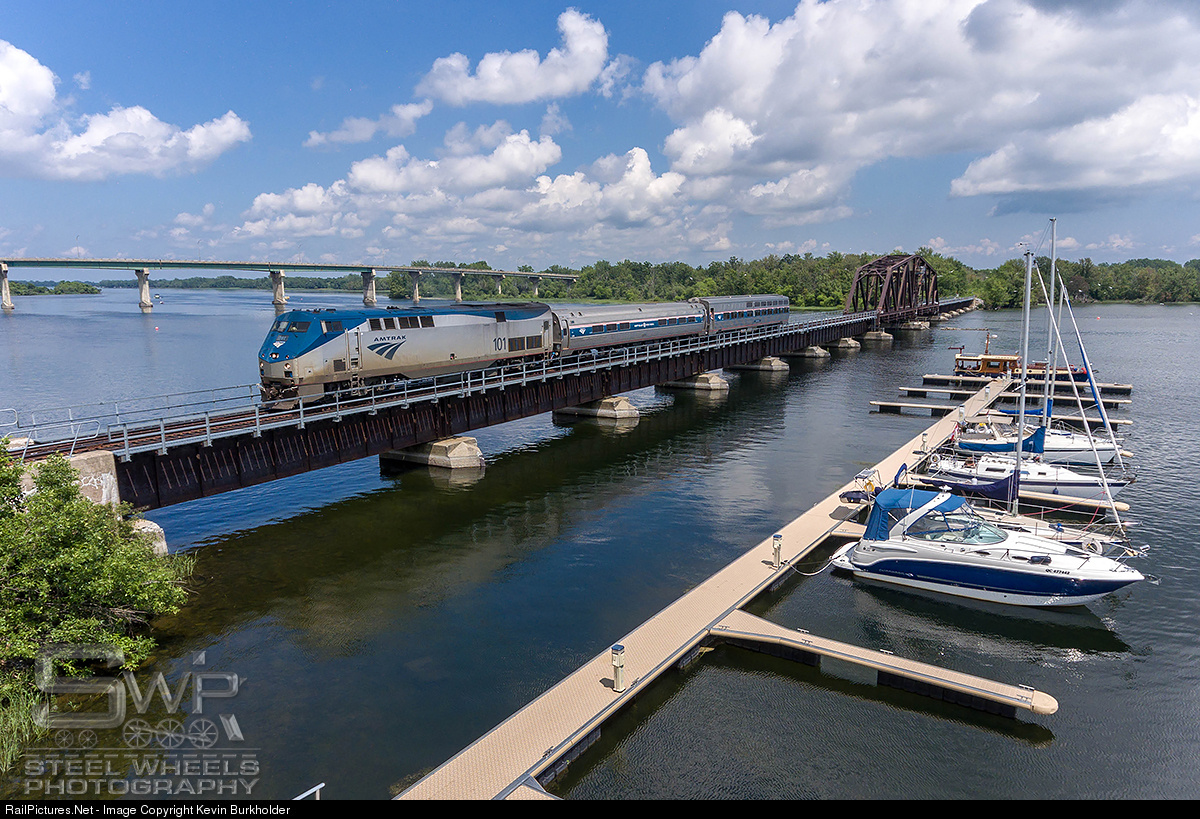 On July 18, Amtrak operated a special trip in conjunction with New England Central, CN and various government officials from the US and Canada, to inspect the route from St. Albans, Vermont to Montreal, Quebec. The train is seen crossing the Richelieu River at the Marina Rose des vents with Amtrak P42 101 leading a cafe car and the American View Viewliner theater car.