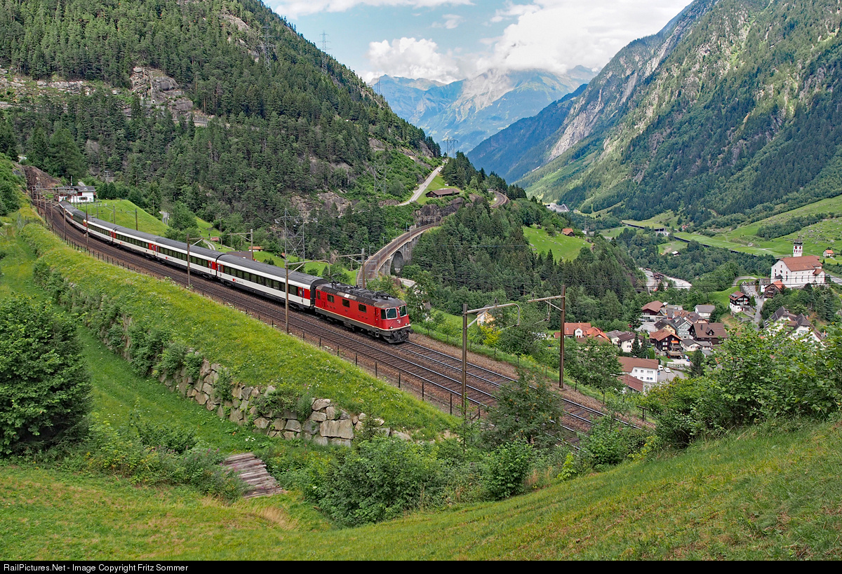 | Old Gotthard mountain line: Headed from Re 4/4 11XXX, IR 2425 Zürich main station-Locarno just climbs up the uppermost level at Wassen and will reach soon Göschenen. In the background on the right you can see the village Wassen with its well known church. |