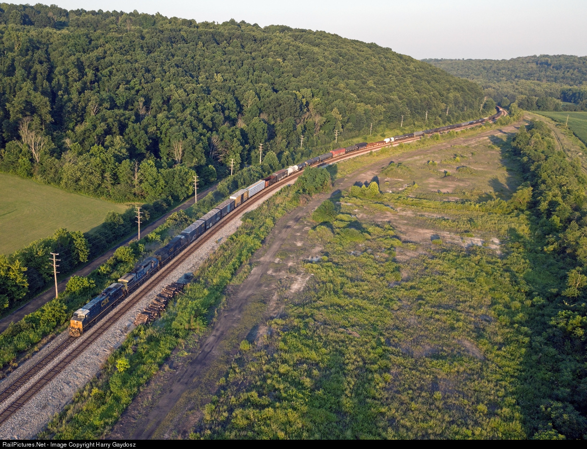 | Kennedy Curve: Was the station name of this location until resignaling of this territory a couple years back. From 200 feet above ground the footprint of the former P&LE main and a small yard for the former US Steel Michigan Limestone are visible. The Stavich bicycle trail is left of the CSX main. |