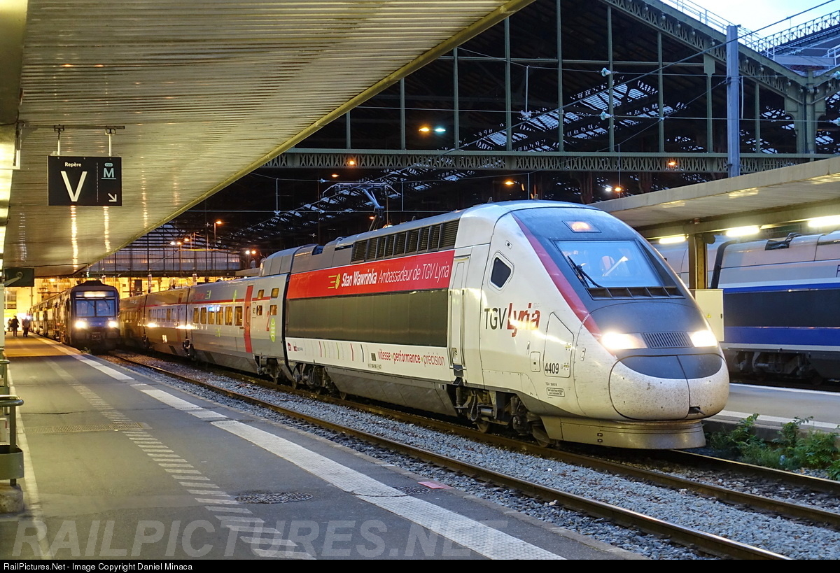 Special livery and marking for this Lyria high speed train with a partnership with the Swiss tennis man Stan Wawrinka. It is the ambassador of Lyria TGV "This exclusive partnership is based on the values shared by the French Open title holder and TGV Lyria: speed, performance, precision". Another Lyria TGV have other kind of "Stan Wawrinka" marking (RPN #620012). Left train assume suburban service and is a Z20500 double deck EMU (dual voltage version).