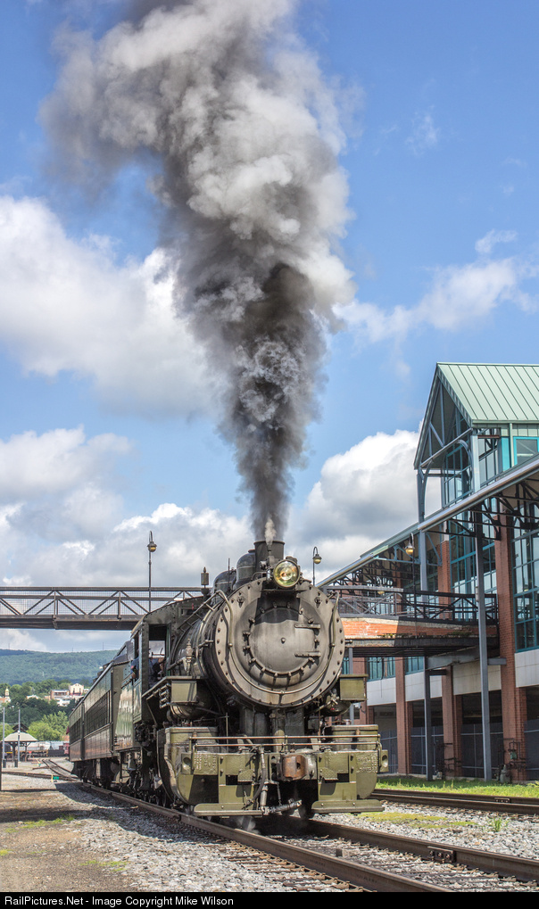 | Steam and Steel: Baldwin Locomotive Works #26 passes the Steamtown Mall on her way along the Lackawanna mainline with a train full of eager passengers riding the "Scranton Limited". The 0-6-0 switcher pulls the "Scranton Limited" on Saturdays through the summer season. |