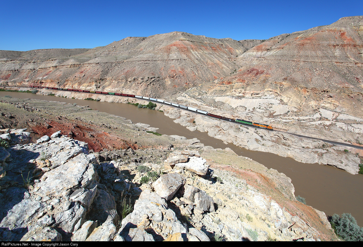 BNSF's Cowley Turn twists slowly thru the scenic Himes Canyon. The canyon is located where the Bighorn River cuts thru this mountain between Kane and Himes, Wyoming. .... The Cowley Turn originates at Greybull, Wyoming and serves the numerous mineral and agricultural producers north along the scenic Bighorn River.