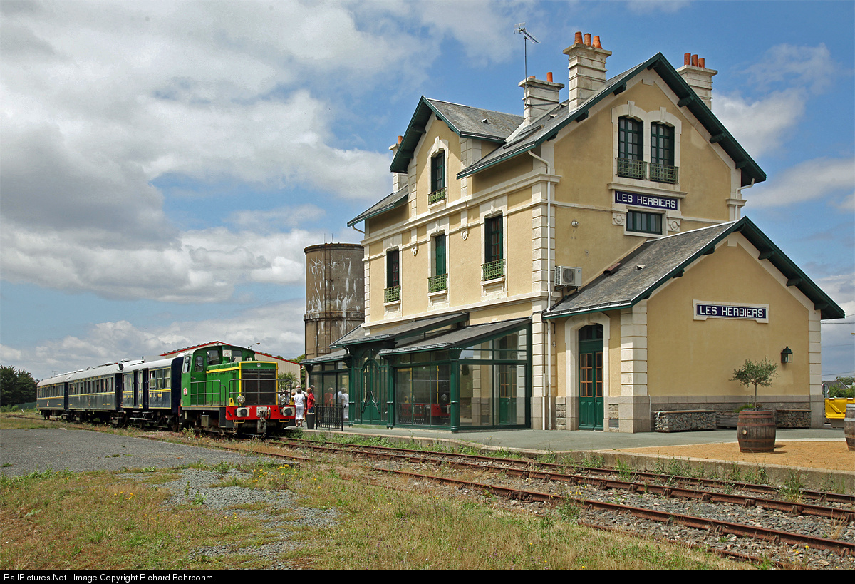| On the heritage railway Chemin de Fer de la Vendée Y.7303, a former shunting engine of SNCF, is waiting with a generator railway car and two dining cars for the return journey to Mortagne-sur-Sèvre. |
