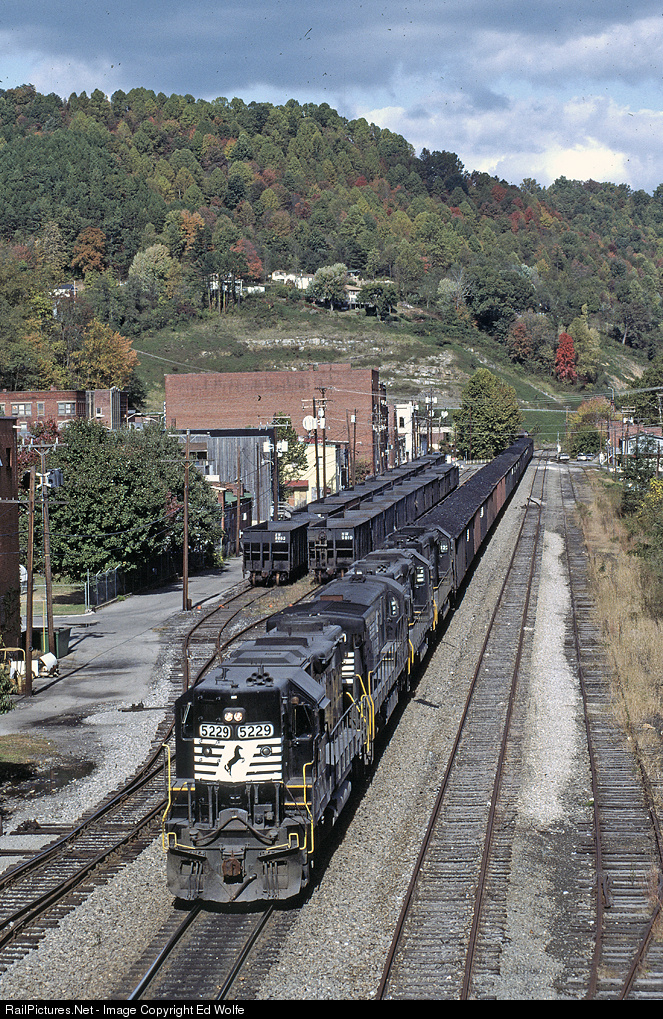 | A loaded "C" train rolls behind "downtown" Appalachia on ex-Southern rails. The "C" commonly stood for "consolidated" as these loads will be consolidated with additional loads at Yuma for the remainder of the trip to Bulls Gap. The track immediately to the right is the ex-L&N's CV main line through town. |