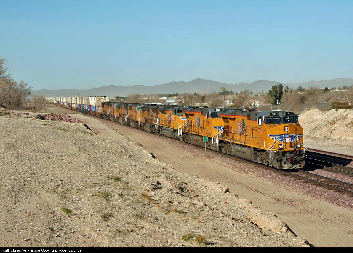 | An early morning eastbound UP stack train, with in the lead 8 units at Lenwood near Barstow, CA. |