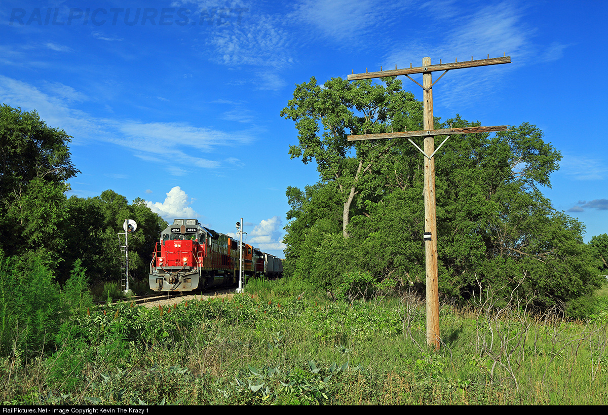 | CORP 4074 is seen approaching the siding at Robertson splitting the old Rock Island search lights just east of the siding. The train will be put away here in the siding so the crew can cab to an eastbound that is tied down just a few miles down the line and will take that train back to Phillipsburg. |