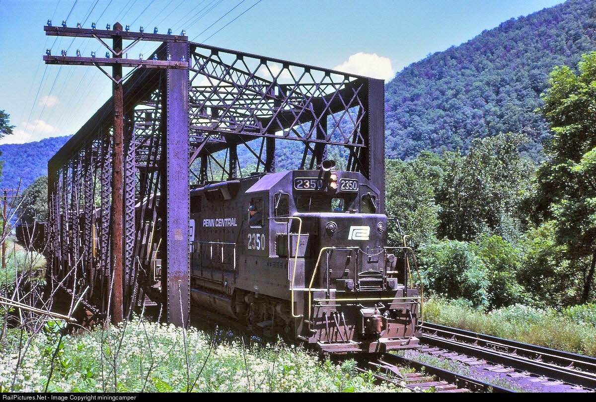 | A Penn Central westbound freight rolls slowly to a meet with the sad little 3-car passenger train from Buffalo, NY. |