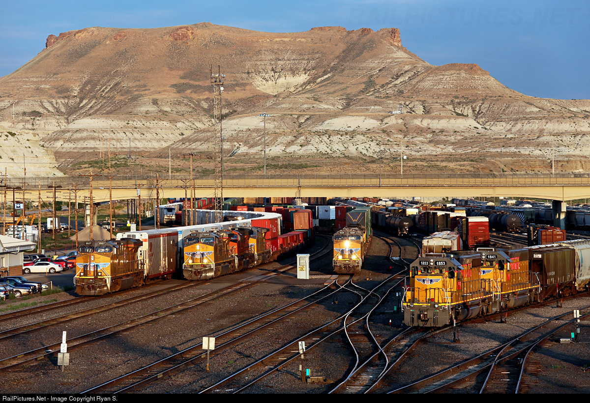 | Busy times on the Overland main! As the sun sinks low in the western sky a trio of westbounds have gathered at the Green River depot awaiting the dispatchers discretion. Amid the parade on the mainline the afternoon westend switch crew goes about their days work at right, utilizing SD40Ns 1853 and 1841. |