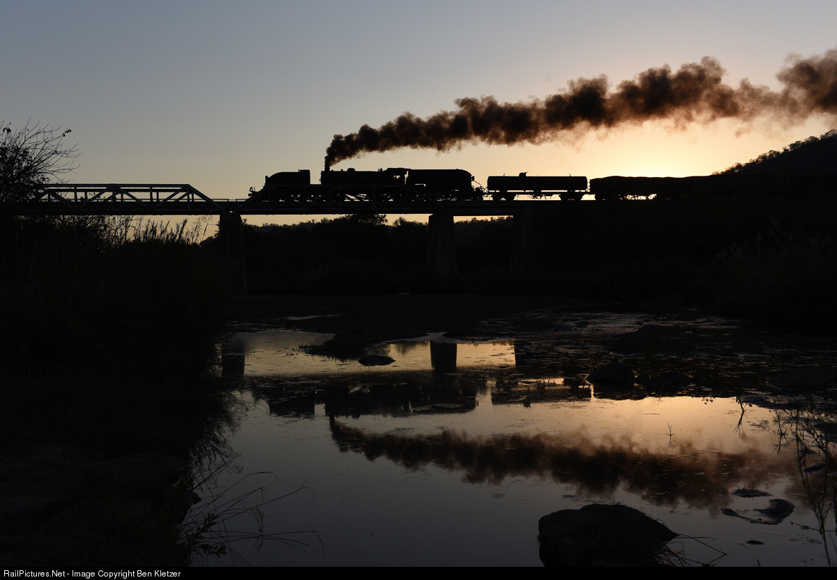 Silhouetted against the setting sun of a winter's evening in Zimbabwe, Beyer-Garratt #414 storms across the Lukosi River with a freight train.