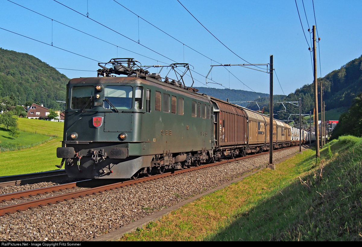 | On August 11th, 2012, the Ae 6/6 11507 "Wildegg" leads a heavy freight train at Tecknau to the north. The side blazons are lacking already for years and their finally end is coming soon. |