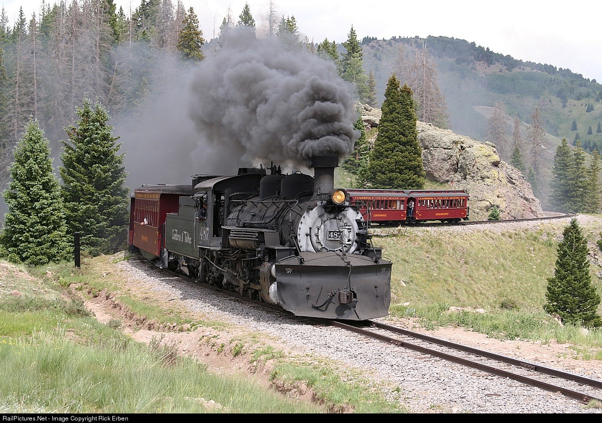 The improbable daily train keeping the lengthy segment of storied narrow gauge line from Antonito, CO to Chama, NM in active service comes steadily chuffing up the long valley as if unencumbered by the passage of time. The way rail travel should be - open windows and vestibules. About halfway between Los Pinos and Cumbres, the venerable 487 presents a nearly timeless image as it climbs through the high country.
