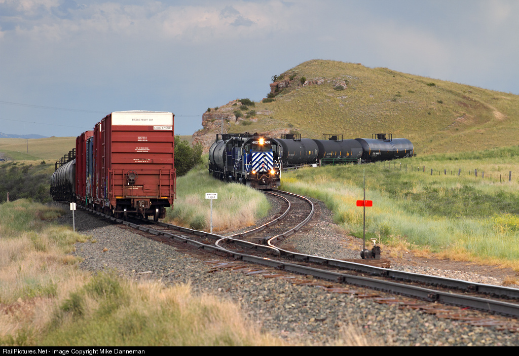 Dropping back to the Fifth Subdivision main line with eight tank cars from a petroleum facility at Logan, Montana, is Montana Rail Link’s 844 local on June 26, 2017. The tank cars on the rear of the train sitting on the main will be spotted up at the plant next. Milwaukee Road’s line to Bozeman crossed here on an overpass, and this steep connection serves as access to a short part of its line was reconstructed recently to serve this fairly new facility built right next to Milwaukee’s abandoned grade. The local is powered by two of MRL’s GP35s, Nos. 402 and 403. No. 403 is no stranger to steep grades being a former Rio Grande locomotive—but MRL No. 402 is former DT&I No. 355, equipped without dynamic brakes!