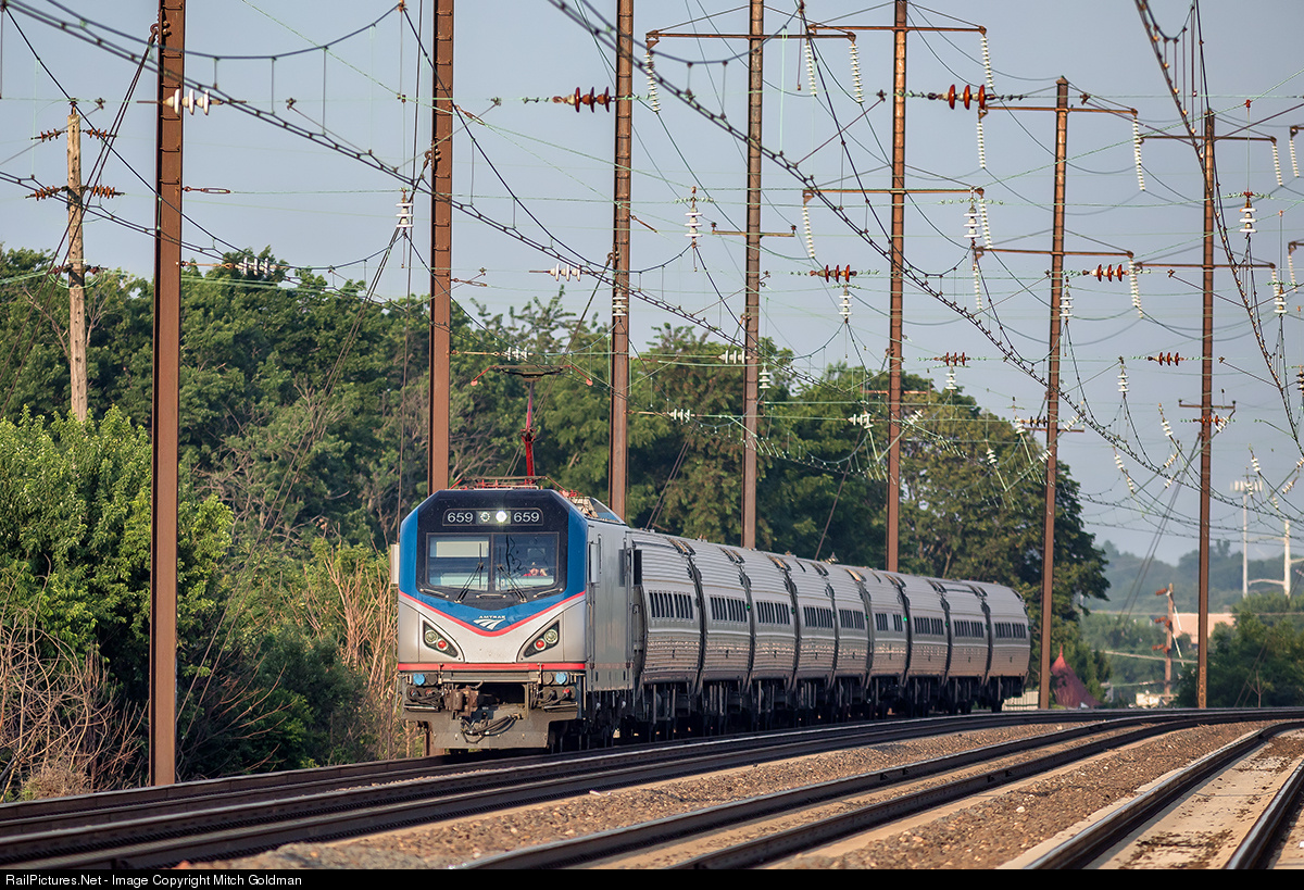 An early morning Amtrak Regional Express led by No 659 speeds through Bristol Township, PA, over the PRR built elevated fill. Oddly several trains were routed on tracks normally reserved for SEPTA's local commuter trains. This train was en route to Trenton, NJ and points north.