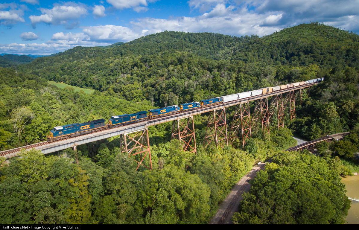 Heading downgrade on their run from Kingsport, Tennessee to Shelby, Kentucky, northbound mixed freight Q697-28 crosses Copper Creek trestle just outside of Clinchport, VA. Time freight has returned to the former Clinchfield Railroad across the Carolinas, Tennessee, & Virginia once again as operational changes at CSX have brought back the pair of Hamlet/Cincinnati manifest freights after a nearly 2 year hiatus following the shutdown of Erwin Terminal and subsequent reroute of through freight traffic in late 2015.