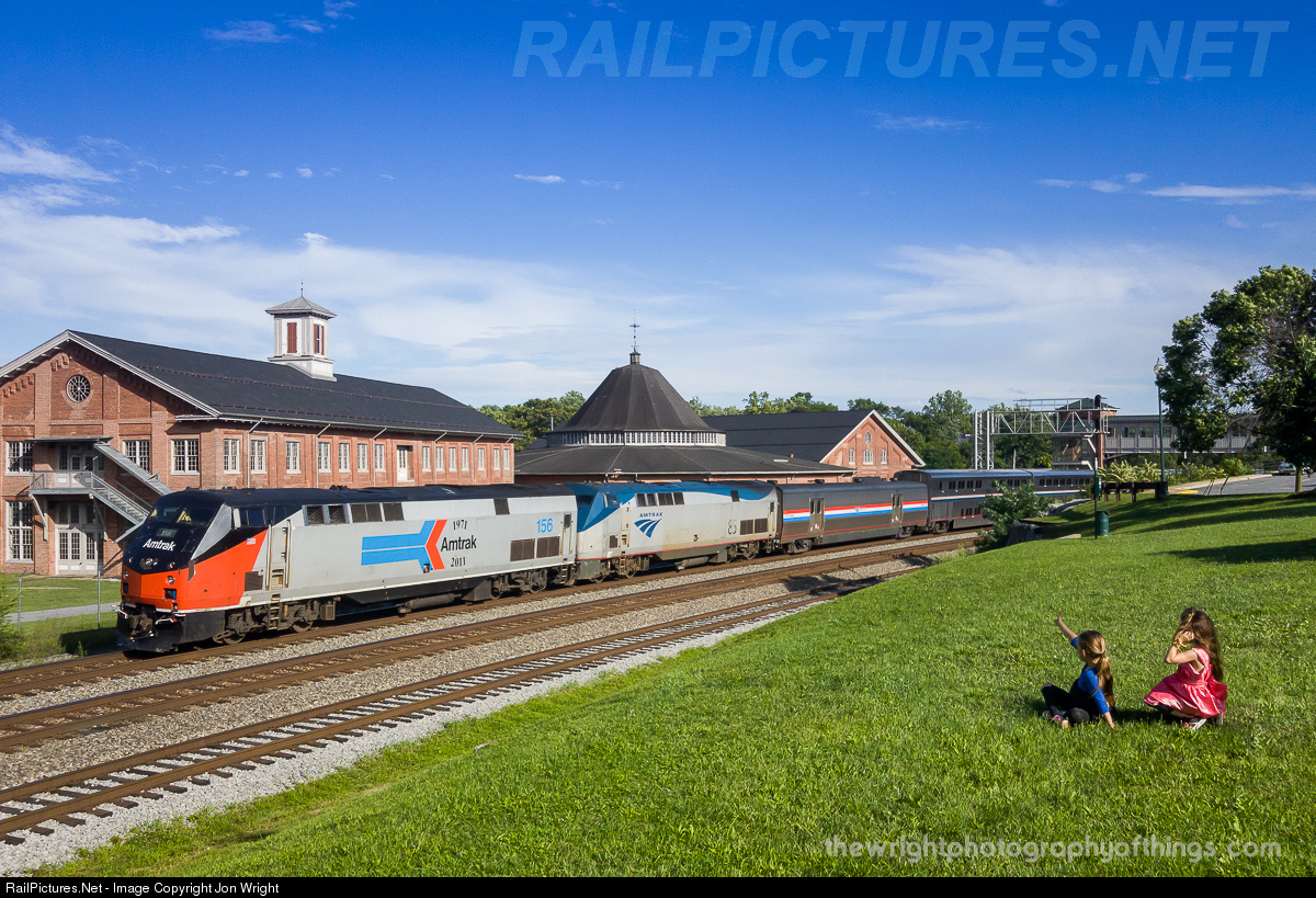 | The Capital Limited arrives at Martinsburg for its station stop on pleasant Summer evening and is greeted by two beautiful girls on the grassy knoll overlooking the old B&O Roundhouse and shops. Taken using my Samsung Galaxy S6. |