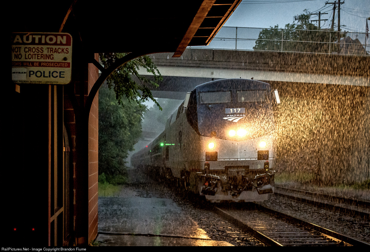 | Delayed by a series of flash flood speed restrictions, Amtrak's Pennsylvanian crawls into the Greensburg station in the pouring rain. |