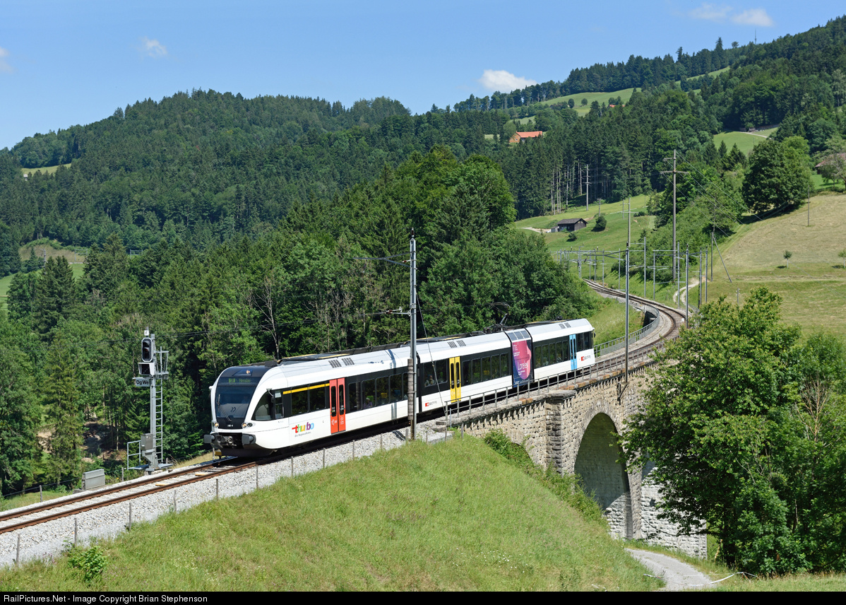 | An SBB Thurbo units crosses the Waldbach viaduct below Degersheim forming the 13.01 Schaffhausen to Nesslau S8 service. The litlle power pack is advertising a Loreley concert at St.Gallen. |