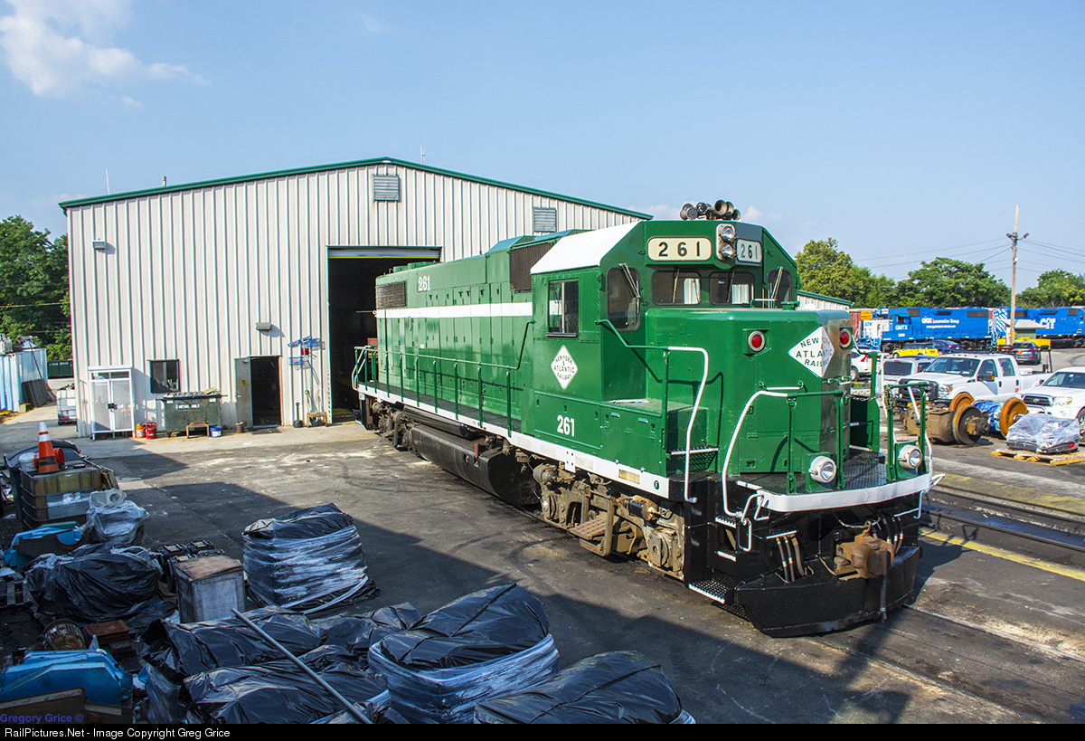 New York & Atlantic Railway GP38-2 261 sits outside the shop at Fresh Pond Yard after receiving a fresh coat of paint. 261 is the only of NYAR's 4 geeps to retain it's original "white stripe" scheme and features hand painted numerals on the side to pay tribute to the original scheme the engine was in when it served on LIRR. |