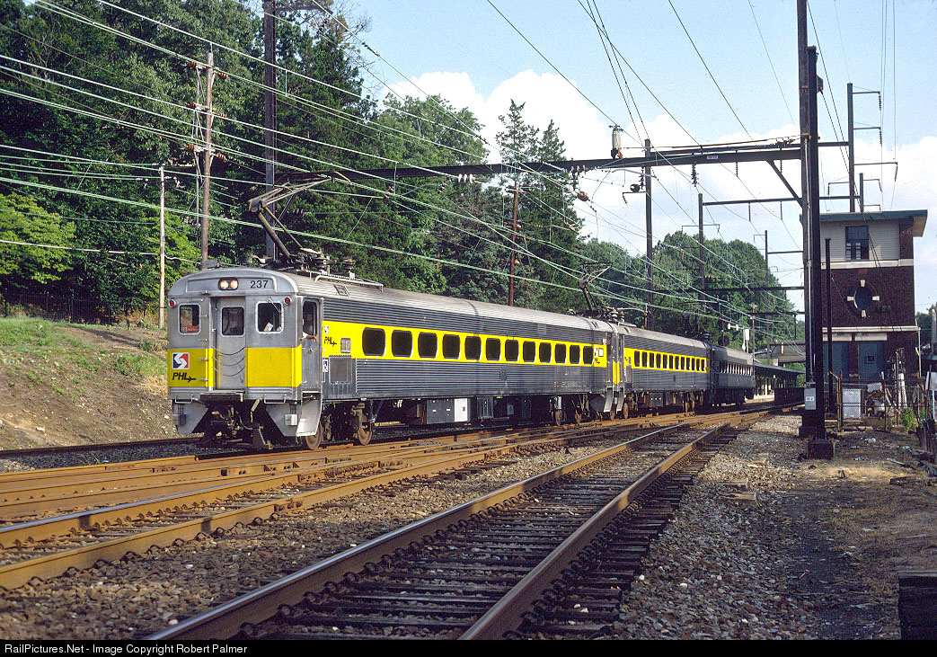 | In 1993, several SEPTA silverliners had yellow bands applied and were supposed to be dedicated to service on the Airport line. However, that didn't always work out. Here, we see 2 of them passing the old Reading RR tower at Jenkintown as they head for West Trenton NJ (A long way from the airport). |