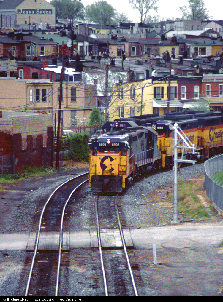 “Jesus Saves” With the rowhouses of South Baltimore in the background, CHGN (Chicagoan), lovingly referred to as the “Locust Point Flyer”, with a seven unit lashup (consisting of CS/B&O GP30 6906, B&O GP9 6477, CS/B&O GP40-2 4148, CS/B&O GP40-2 4213, CS/B&O SD50 8586, CS/WM GP9 6400, and CS/B&O GP40-2 4336) is westbound at Leadenhall St. (mp 0.5) on B&O’s Locust Point Subdivision, late in the afternoon of April 26, 1986. In a quarter mile, the train will enter the Washington Sub at BY (Bailey) interlocking to begin its westward trek in earnest.