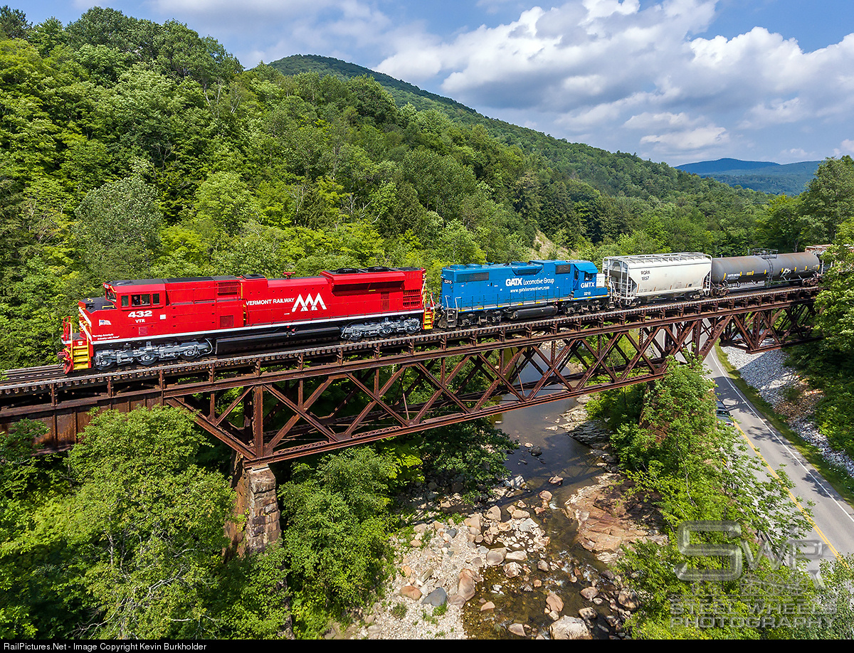| A busy home state tour on tap this weekend and plenty of rail activity was off to a good start Friday morning with the debut of the Vermont Railway SD70M-2 432 in road service on the Green Mountain Railroad. The VTR 432 is seen teamed up with what is a growing number of GMTX GP38-2s on the property as they cross the Mill River on the famous ex-Rutland hanging bridge at Cuttingsville. |