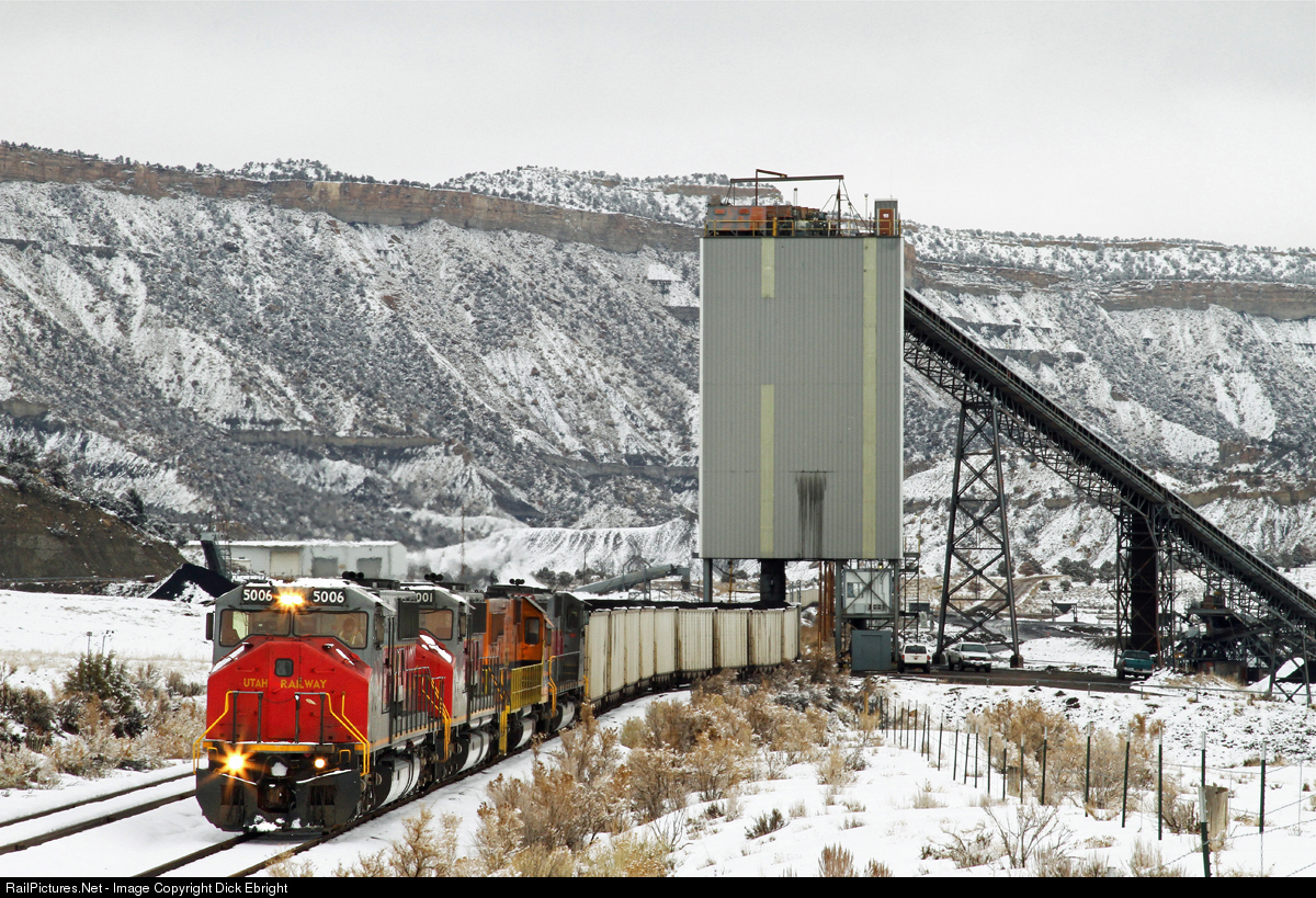 | Utah Ry. loads another trainload of coal for the Intermountain Power Project plant near Delta, Utah in this late winter shot. That square white object with a window just to the right of the loading chute is the control room for the Wildcat flood loader. For a view of it’s interior see my photo #596848. Several of these MK units are now working for the Kyle RR in eastern Colorado and Kansas. |