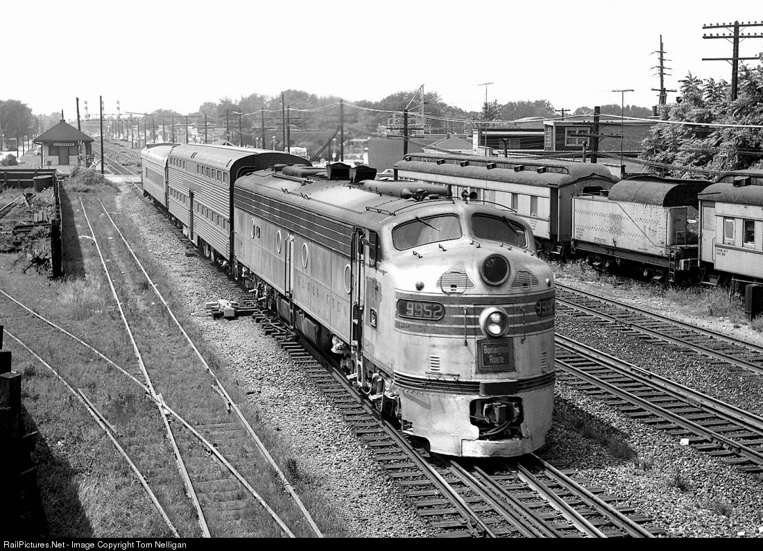 Before the revival that began in the late 1970s, many off-peak Chicago commuter trains were rather modest affairs. A Burlington E8 that had became the property of Burlington Northern five months earlier leads a single gallery car and a generator car on a midday local inbound from Aurora, seen leaving the stop at La Vergne.