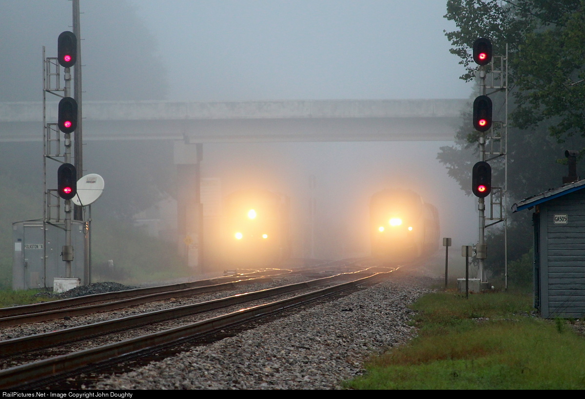 As Amtrak 824 came south from Jesup, it pierced through the morning fog and approached the interchange at the north end of Folkston. Suddenly, a doublestack from Waycross, lead by CSX 5417, rounded the corner and came into view on the left. The drag race was on! Amtrak won, and it was exciting to watch and listen to on the scanner as the engineers were talking to each other.