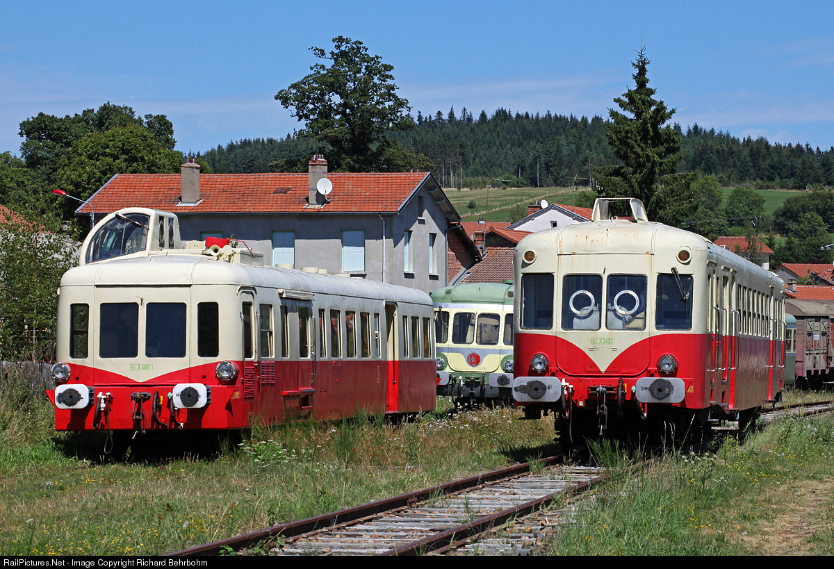 | Rolling stock of association Chemin de fer du Haut Forez (CFHF) : X 2425, constructed in 1953 by Renault/Decauville, X 4001 with the nickname "Picasso". The green X 2709 is a RGP (Rames à grand parcours / long distance train). |