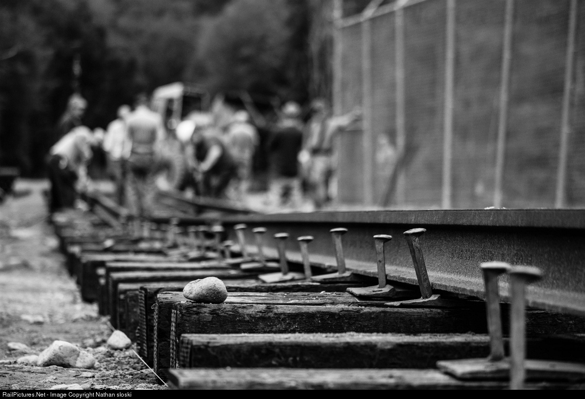 . The Naugatuck RR's Plan to expand their shop yard is well under way as volunteer crews work hard laying track (in background). At the same time, new spikes are waiting to be driven into their place.