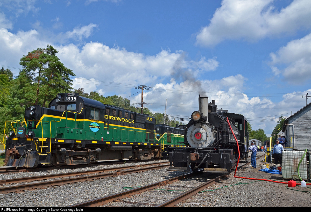 | Steam returns to the Adirondacks! For the first time in recent memory a steam engine is operating in the Adirondack Park. The Adirondack Scenic Railroad is celebrating it's 25th anniversary with a special steam train. The Viscose Co. #6 Baldwin 0-4-0 is seen at the Thendara Station getting water and coal for the next trip.
