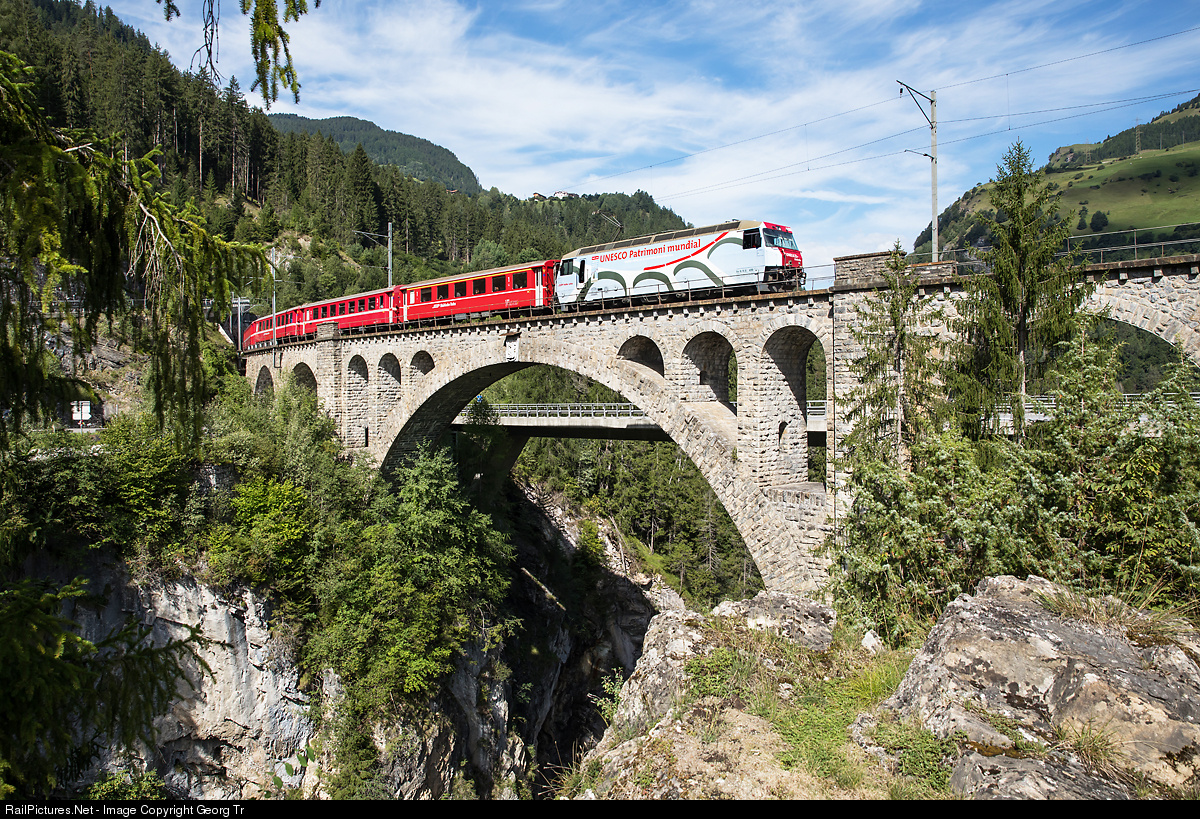 | Ge 4/4 III # 650 with publicity paint scheme for UNESCO world heritage Albula Bernina is pulling the Regio Express 1129 from Chur to St.Moritz over the 164 meter long Solis viaduct. This is with a hight of 85 meter above the Albula river the second highest bridge of the Rhaetian Railway and the third highest railway bridge in Switzerland. The main span of this viaduct is 42 meter, it was built in 1902 by engineer Hans Studer and has a parabolic bow, new in that time periode. |
