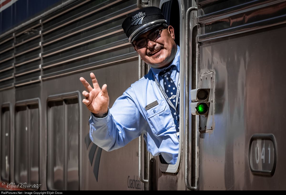 Living his dream, Assistant Conductor Trujillo waves to the camera as his train, Amtrak's Southwest Chief slowly pulls away from the station platform in Lamy, NM.