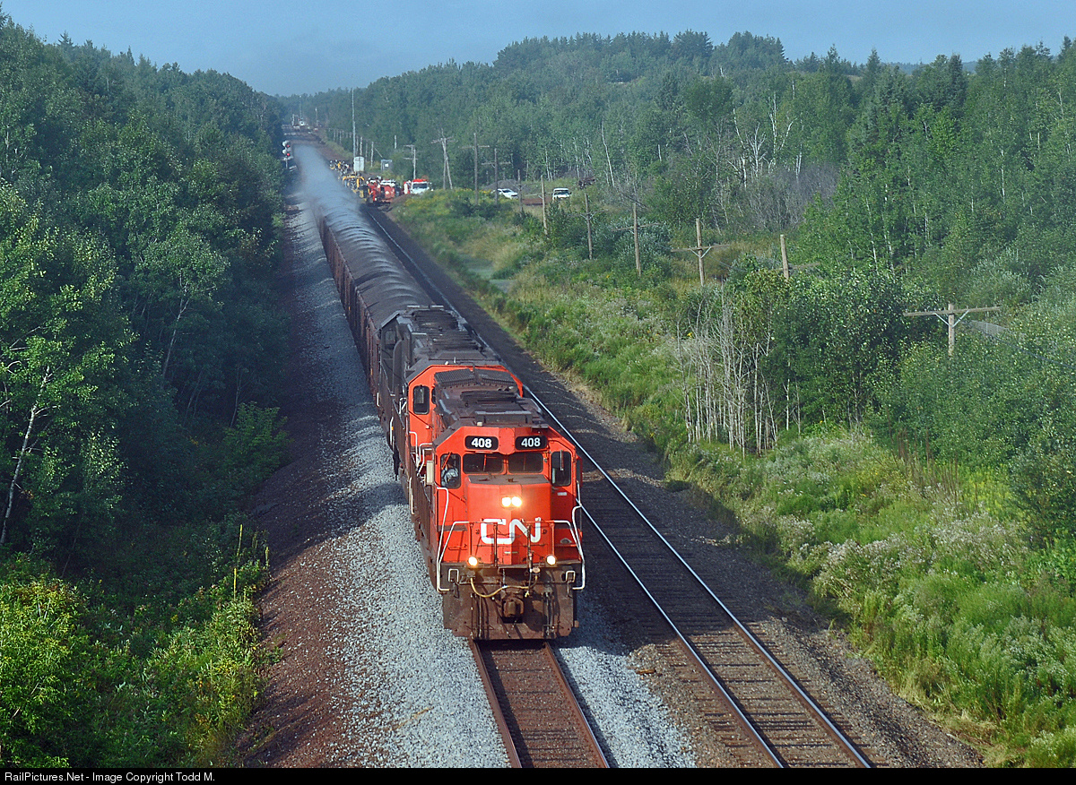 | The morning fog that was so vision restricting a few hours ago has mostly burned off now as the U-791 from U.S. Steel Minntac to Two Harbors cruises track speed passing some CN M.O.W. people including a track gang getting ready to start their day replacing ties. |
