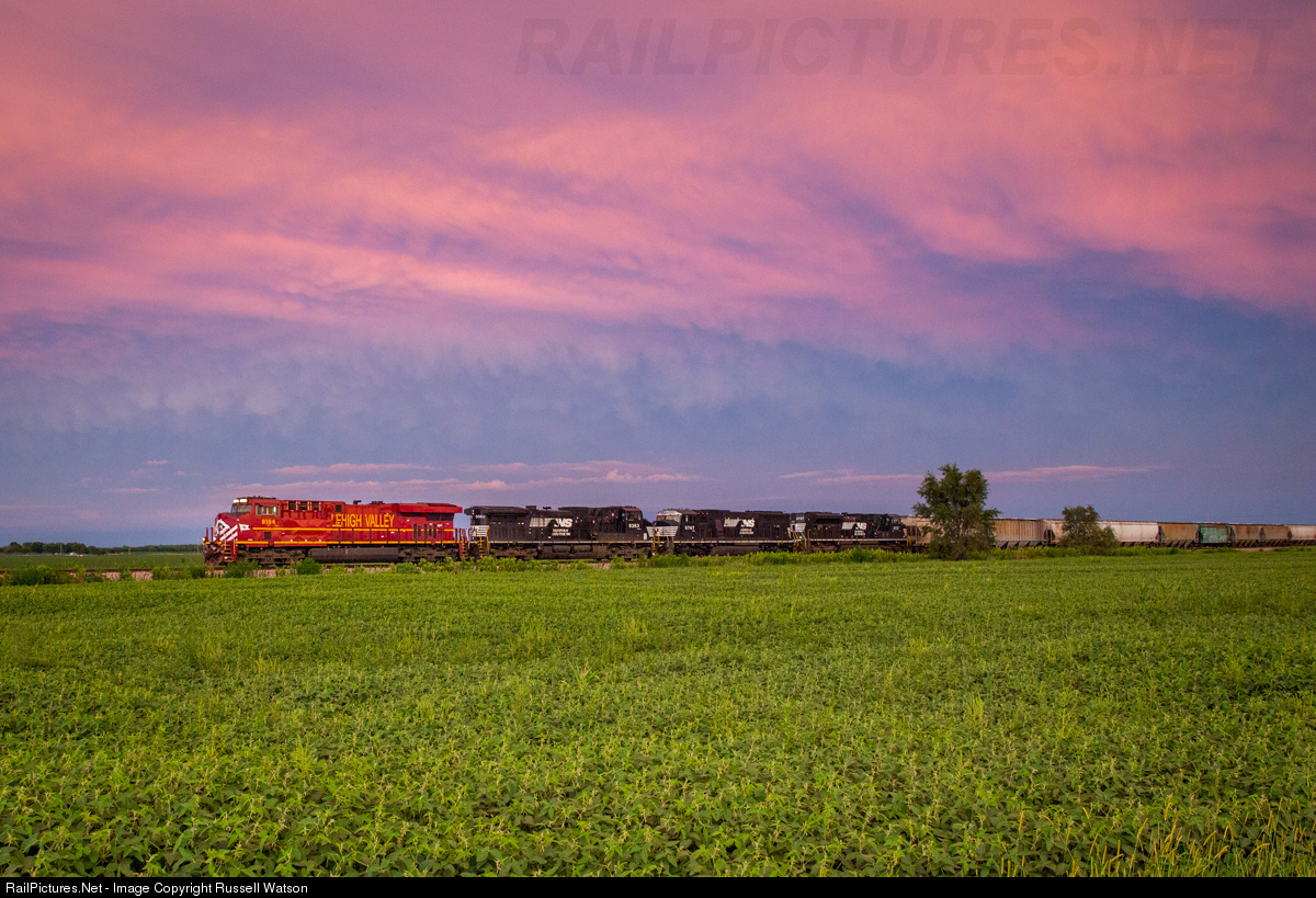 | Kansas sunsets and stormy skies make for a colorful backdrop as the NS 8104 Lehigh Valley heritage unit charges up the Ark City Sub just after sunset leading an empty unit grain train to Kansas City. |