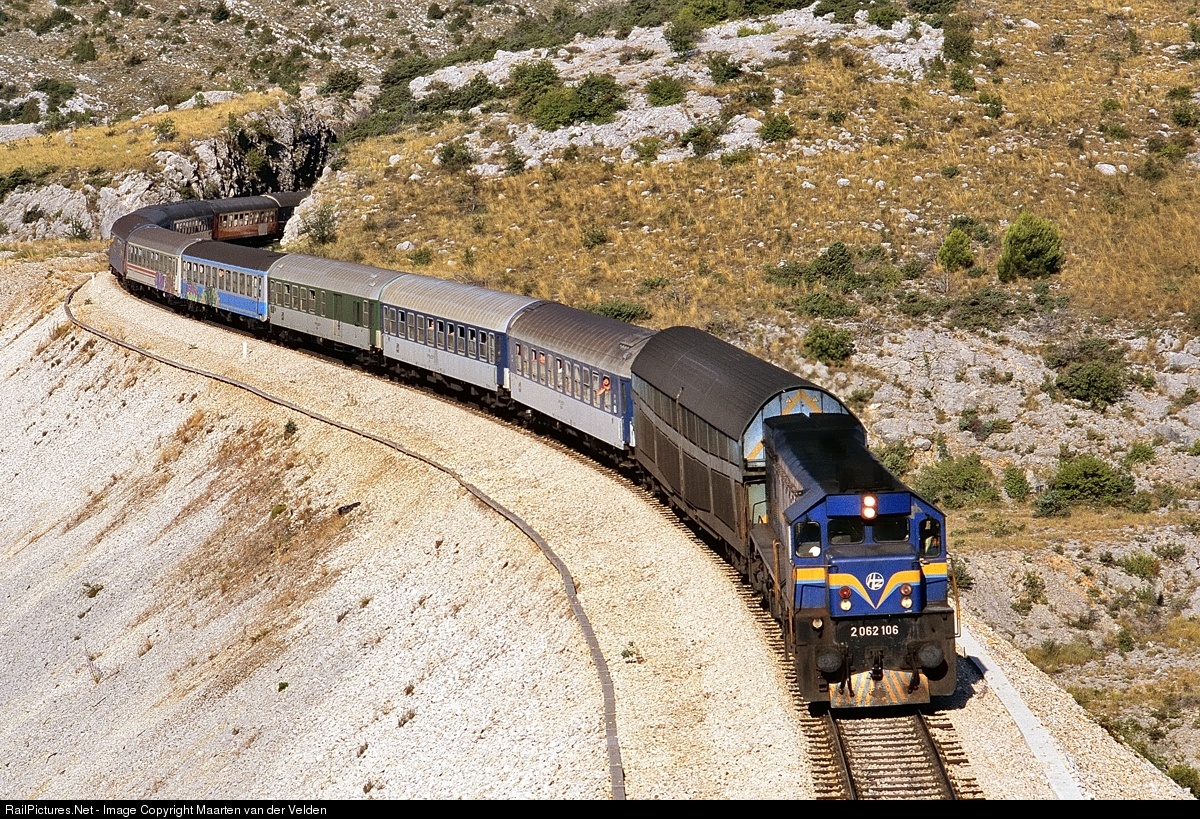 HŽ Vuča vlakova 2062 106 with D 1823 from Praha hl.n. and Zagreb Glavni Kolodvar to Split. The first car in the train is for the transport of cars. The train was about 3 hours and 40 minutes delayed.