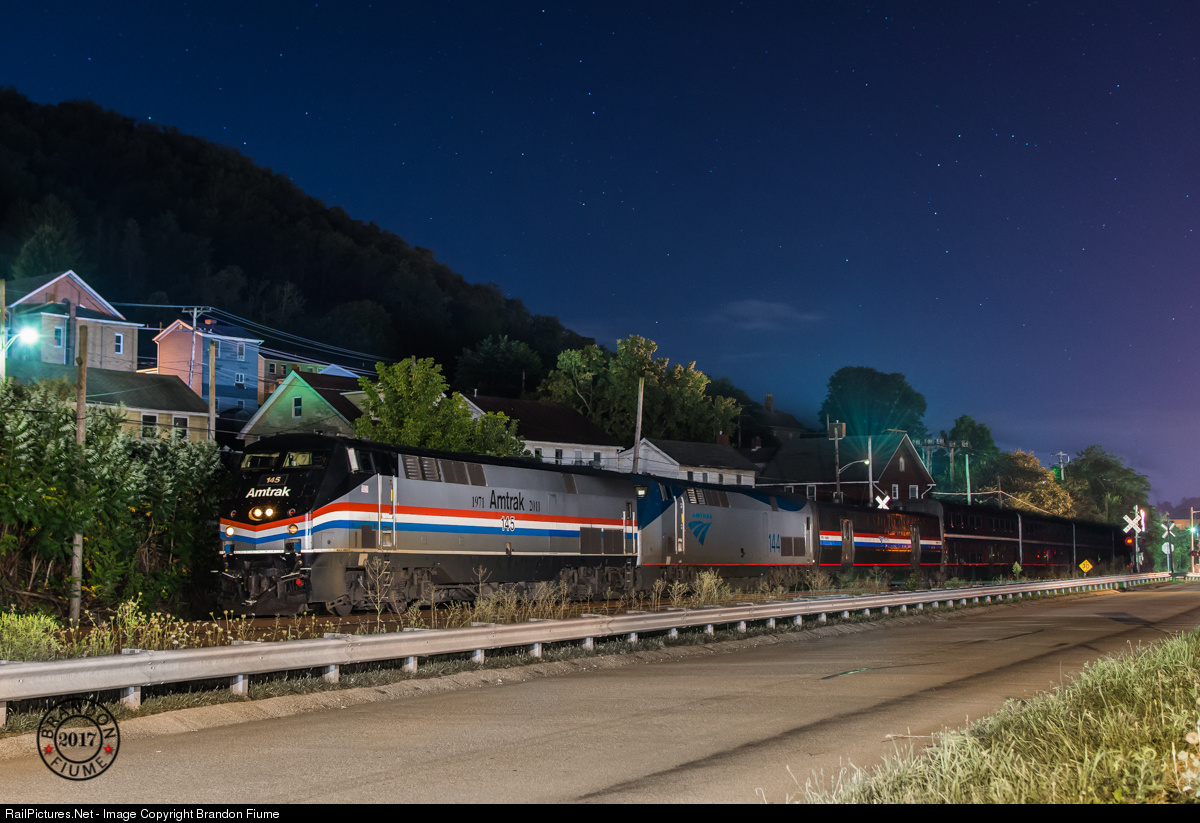 After spending nearly six weeks on the Pennsylvanian between Philadelphia and Pittsburgh, Amtrak 145 escapes its regular duty and heads back west to Chicago, passing West Newton, PA on the Capitol Limited.