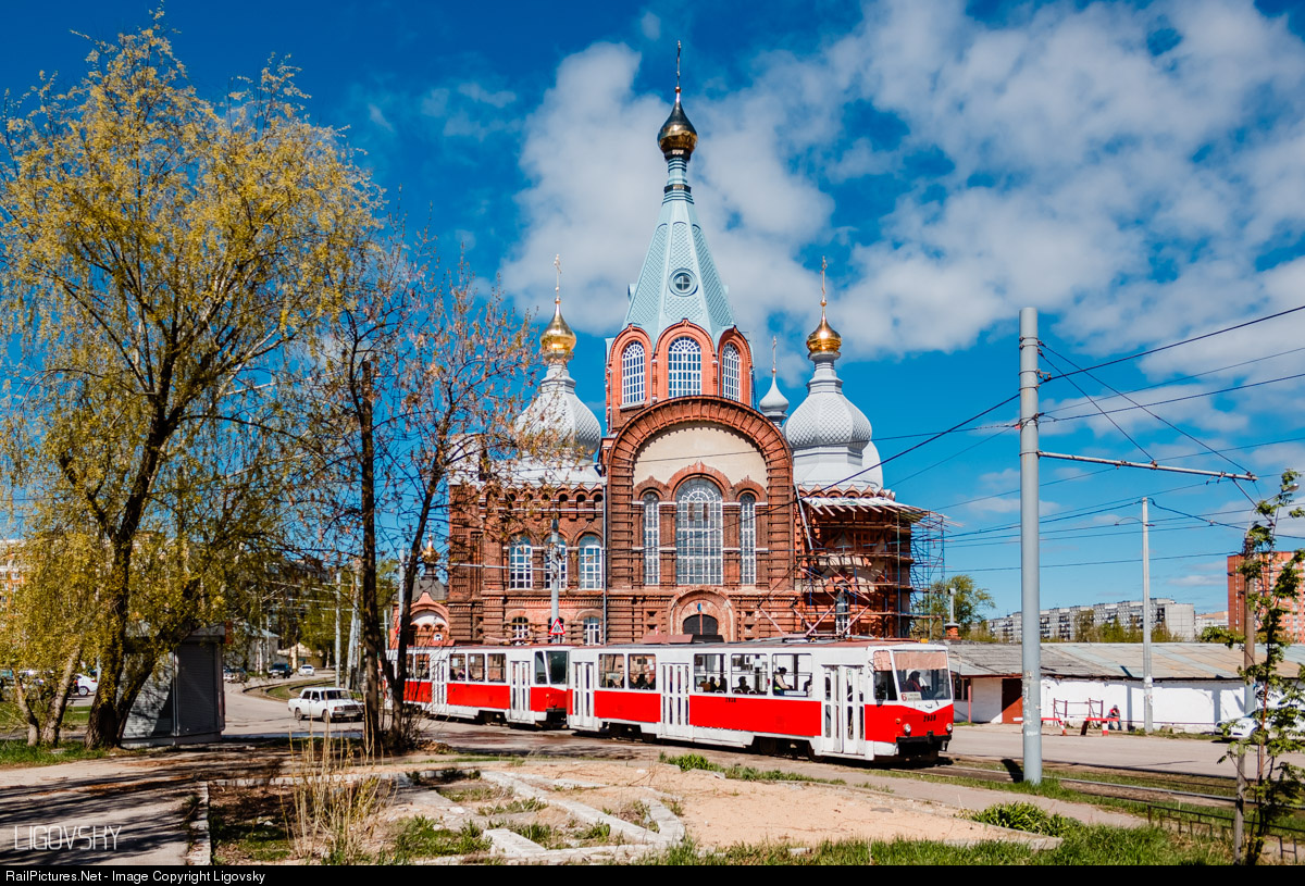 Tram and church of Vladimir Mother of God in Nizhniy Novgorod.